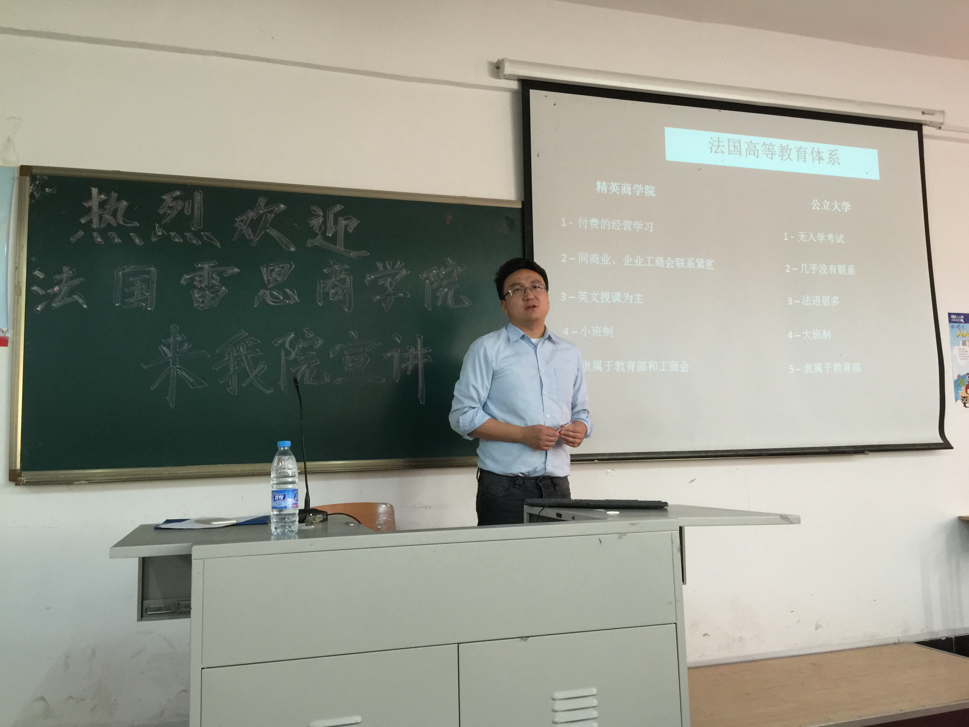 5月7日,法国雷恩商学院硕士项目宣讲会在我校第三教学楼举行。我院外事处老师与来自西语系、管理系部分同学参加了此次项目宣讲会。在宣讲会上,来自法国雷恩商学院中国校方代表与在场的老师、学生共同分享了出国留学的经验和体会并详细介绍了法国雷恩商学院硕士项目课程的内容及留学法国的优势。 此次项目说明会为我校有意向前往法国攻读硕士学位的学生提供了良好的契机。