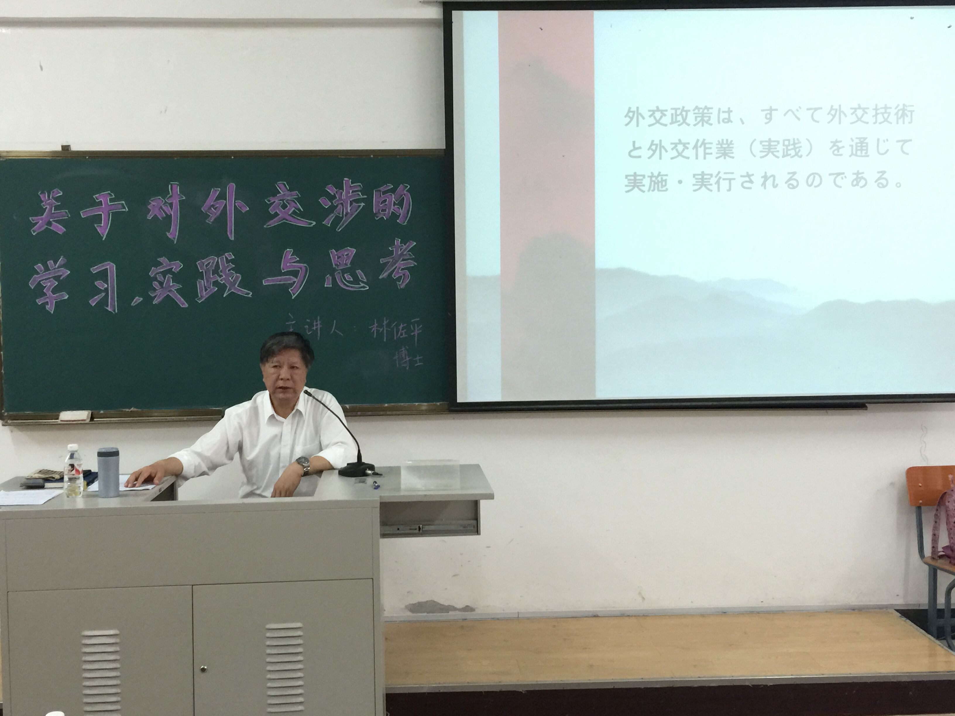 6月10日,中国国际教育交流协会常务理事、我院客座教授林佐平博士在我院第三教学楼举行以《关于对外交涉的学习、实践、思考》为题的专题讲座,西语系、东语系、管理系、中文系等近二百人听取讲座,讲座由外事处处长崔建立主持。
