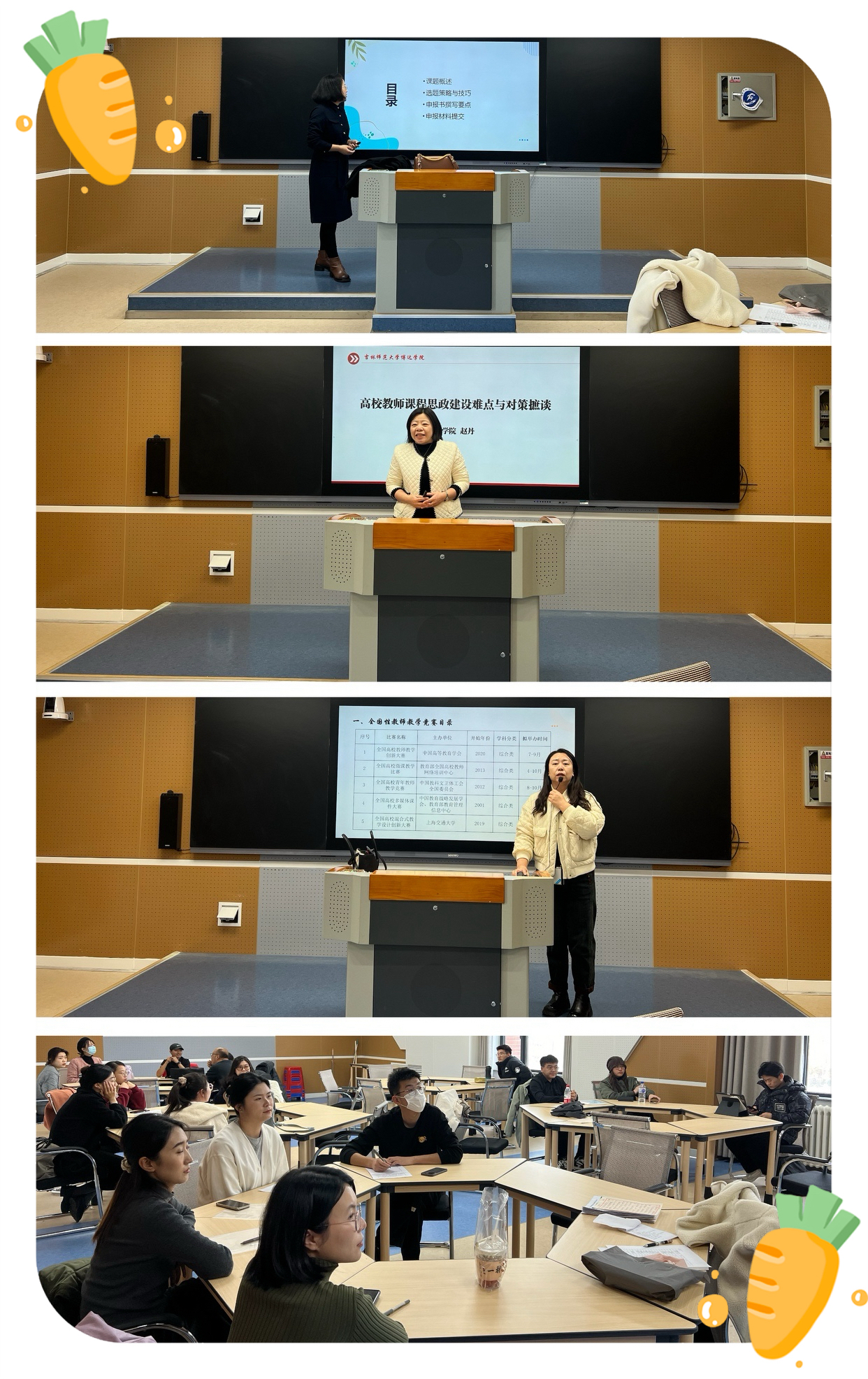 最后,吕院长展示全国性教师教学竞赛目录,详细列举微课教学比赛、教学创新大赛、高校混合式教学设计创新大赛参赛内容、备赛要求和评审标准,同时总结参赛可能遇见的问题及注意事项。