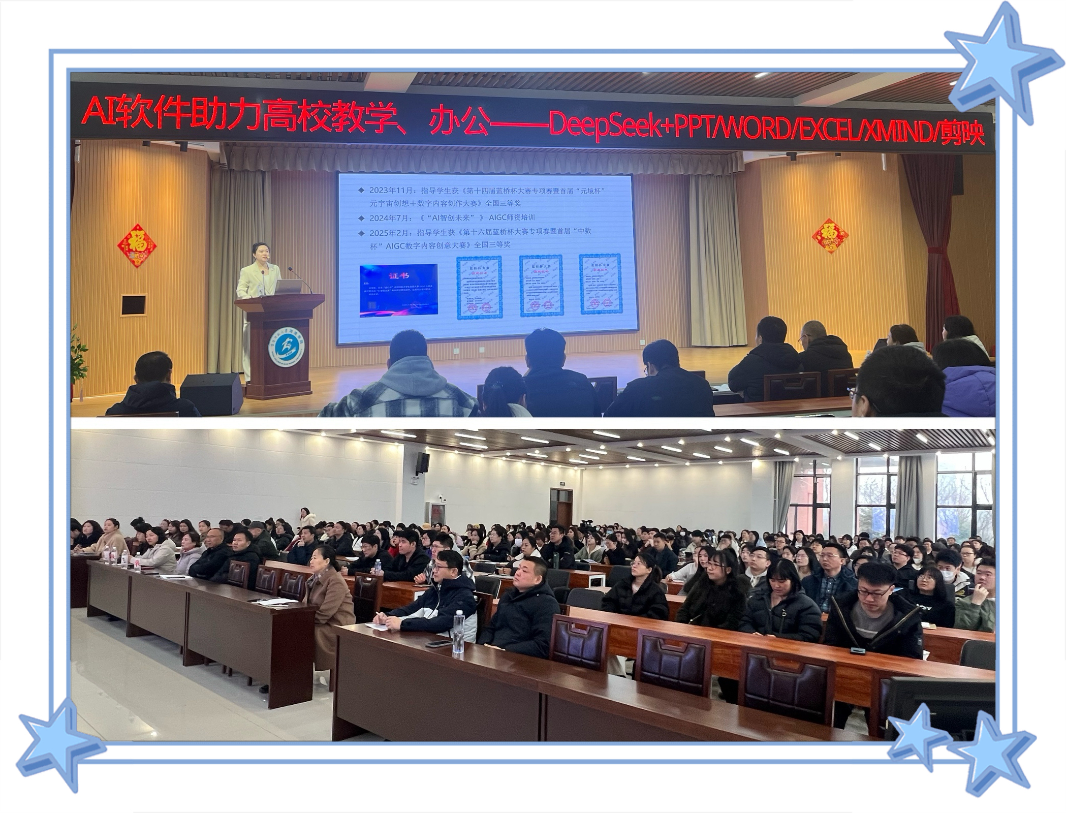 为进一步提升我校专职教师和教学管理人员人工智能素养,推动人工智能技术与教育教学深度融合,加快教育教学数字化转型,3月1日上午,教务处邀请计算机与信息科学学院专职教师王文在图书馆报告厅为我校全体专职教师和教学管理人员作“AI软件助力高校教学、办公——DeepSeek+PPT/WORD/EXCEL/XMIND/剪映”专题讲座,为我校新学期教育教学质量提升赋能开篇。教务处处长赵亚芬、就业创业工作处处长刘庆斌、学生工作处处长刘丽、大学生职业技能培训中心主任王艳荣及部分学院院长出席本次讲座。