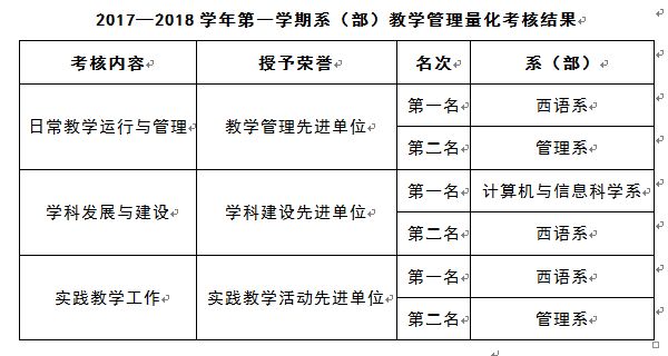 根据《星空游戏中心入口系(部)教学管理量化考核实施细则》要求,教务处依据各系(部)日常教学管理情况及提交材料进行全面、客观、公正的考核,经工作组审核,现将2017—2018学年第一学期系(部)教学管理量化考核结果予以公示。