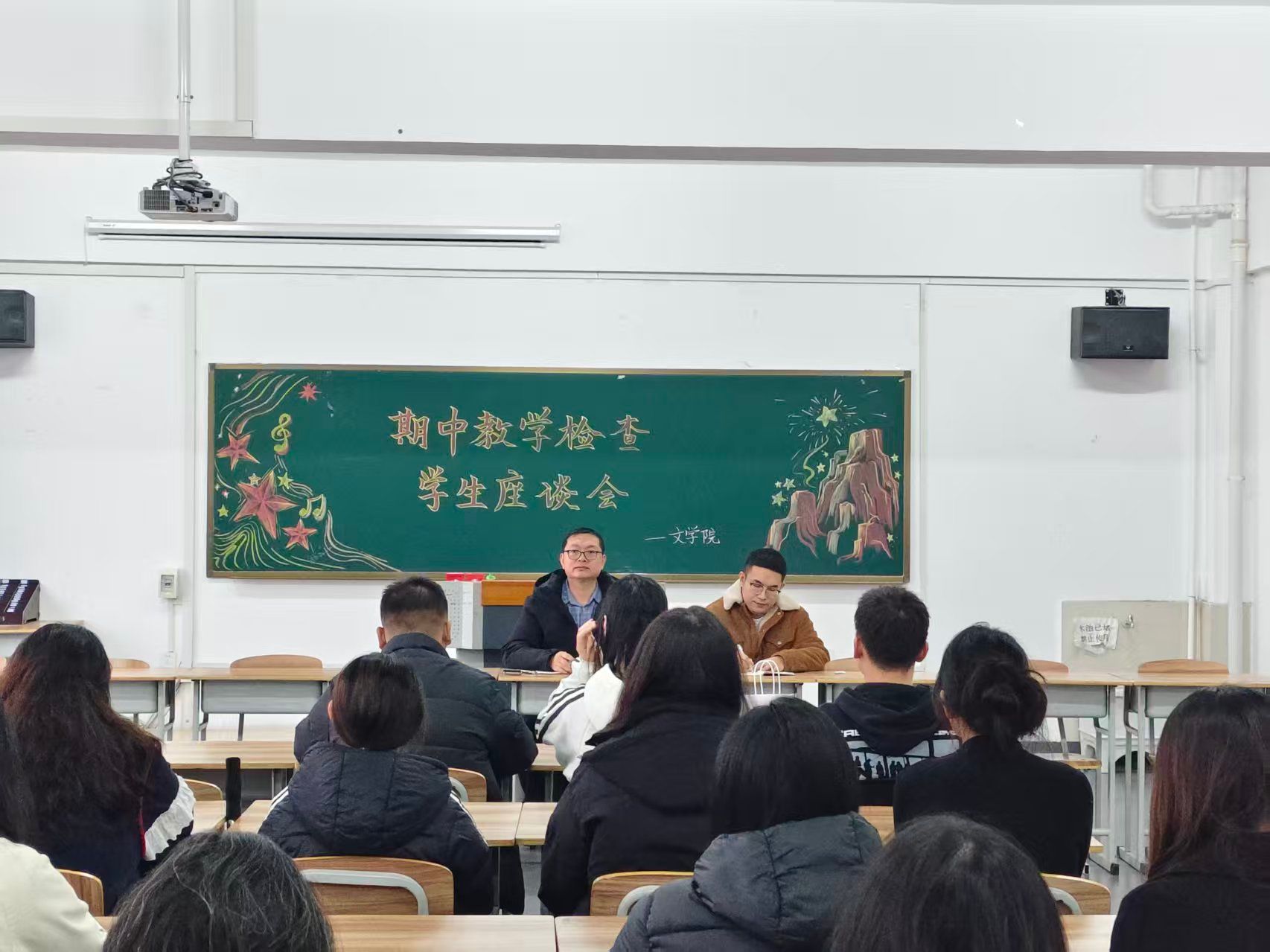 为进一步了解学生在校学习情况,听取学生对教学工作的意见与建议,提升教学质量与管理水平,文学院于2025年10月29日下午15:30至17:00在综合楼1508教室召开了期中教学检查学生座谈会。会议由教学院长王大刚老师主持,辅导员肖扬老师及各年级学生代表共同参加。