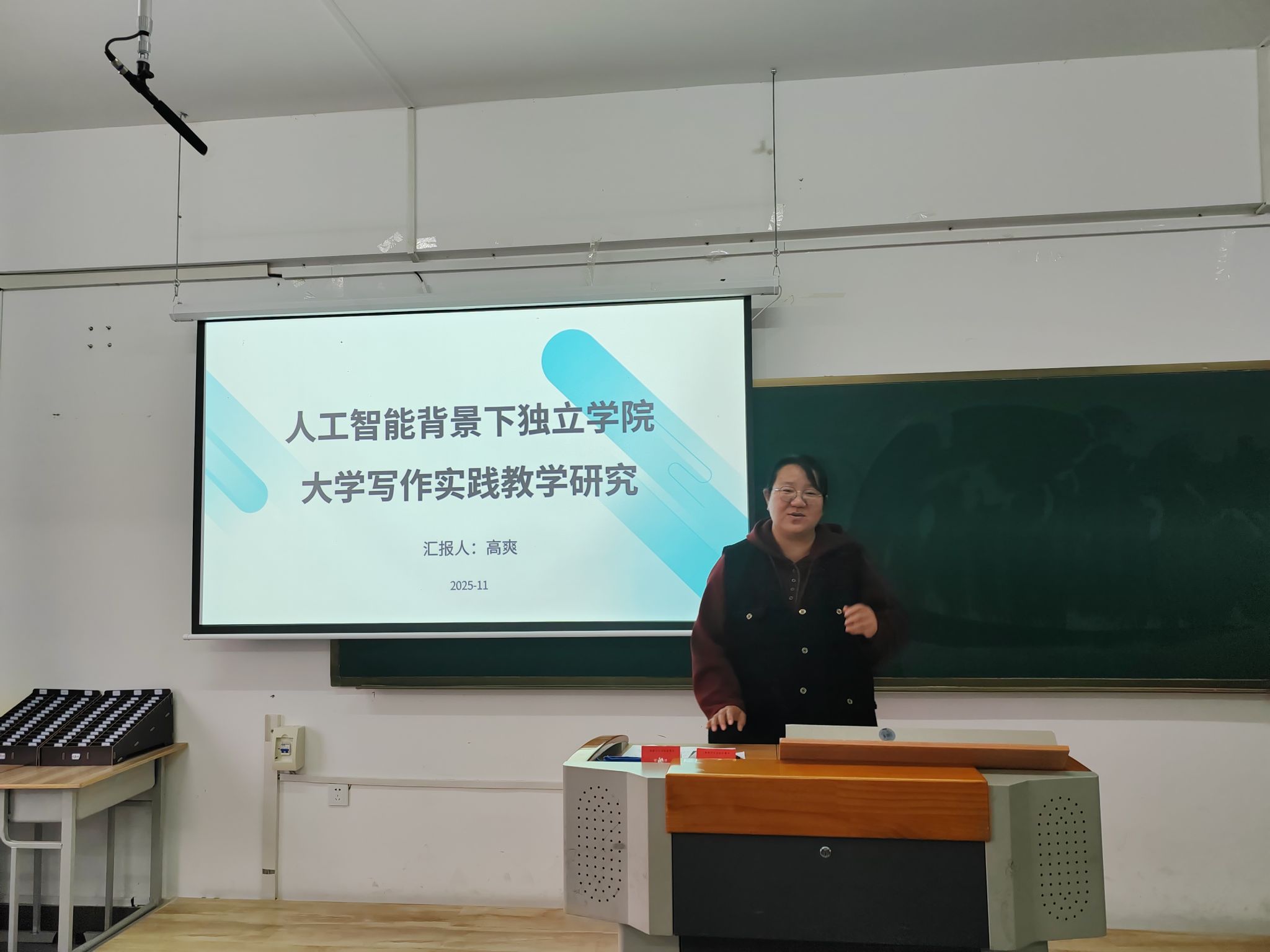 11月26日14时,文学院组织召开“人工智能背景下独立学院大学写作教学研究”专题教研活动。高爽老师就核心议题作了系统汇报,为推进人工智能与学科教学深度融合提供了研讨平台建设思路。